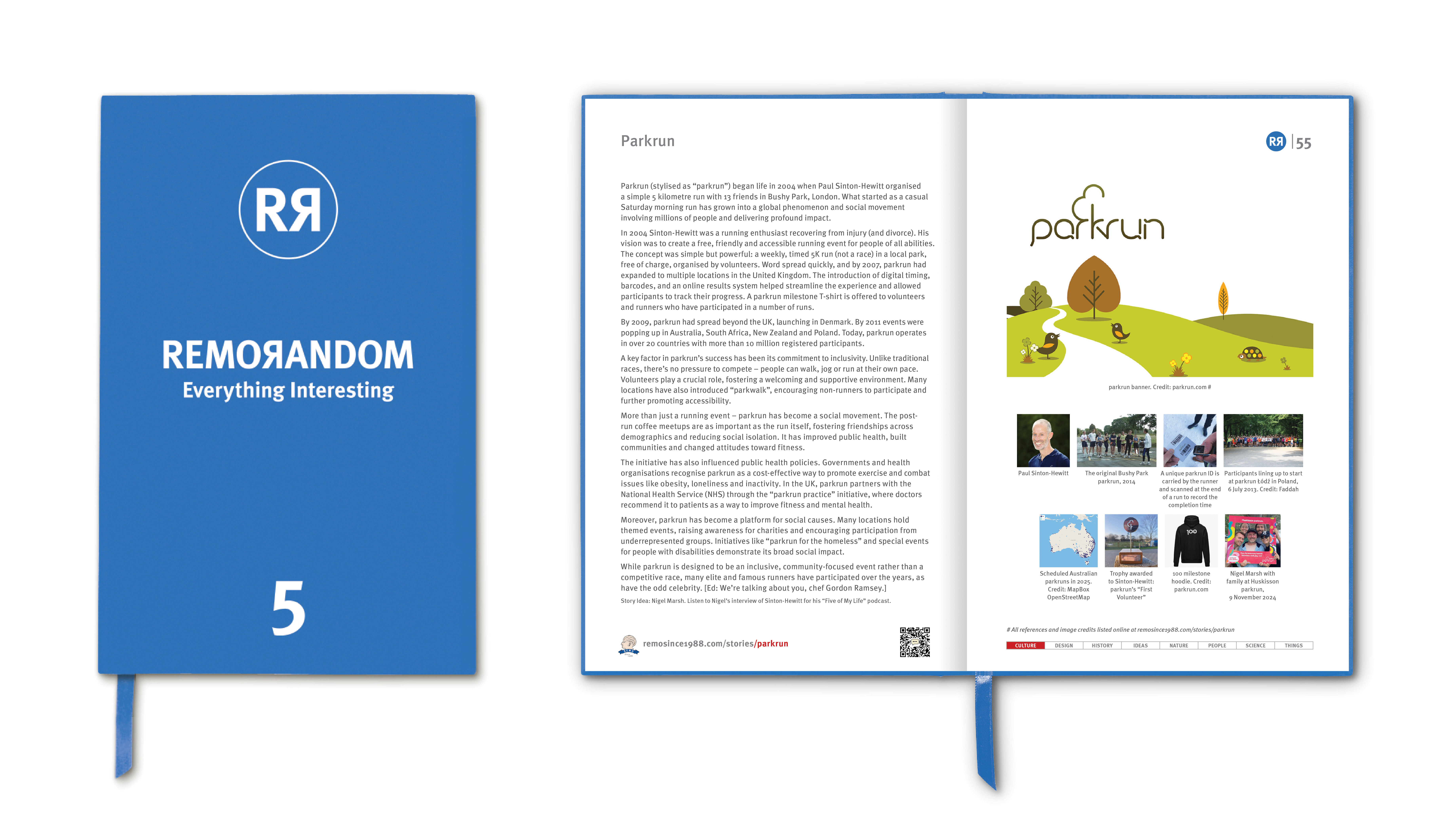 For this episode of the REMORANDOM video podcast, Remo chats with long time friend of REMO and supporter Nigel Marsh about three of the ideas that he has contributed to the book series: The Shipping Forecast [RR3:74], Christian Crosses [RR4:19] and Parkrun [RR5:55]. Nigel is an interesting bloke. From leading global ad agencies here in Australia to launching worldwide movements such as Earth Hour, Nigel's career bridges boardrooms and big ideas. Best known for his popular TED Talk (recorded at the very first TEDxSydney in 2010) "How to make work-life balance work" and his international bestselling book Fat, Forty and Fired, Nigel's journey is all about asking better questions. Which led him to create his own award winning podcast "Five Of My Life". All will be explained. Enjoy the talk.