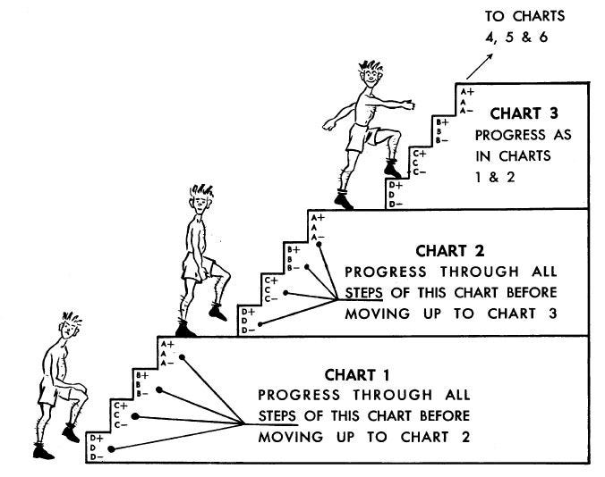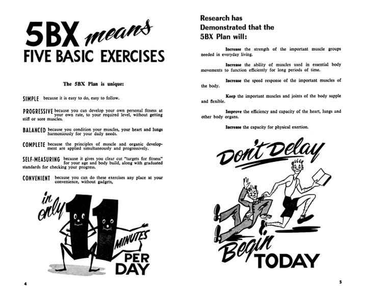 The 5BX program, along with a corresponding program developed for women under the name XBX (Ten Basic Exercises) [Ed: Why do they have to do more?], comprises six charts, each presenting a sequence of five exercises that increase in difficulty.
