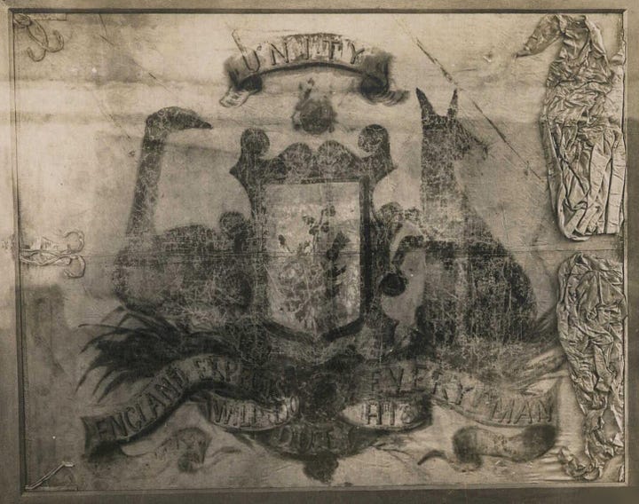 The original version of the arms (with a red cross in place of the State logos) was authorised by King Edward VII on 7 May 1908. It was inspired by and based on the Bowman flag, designed by John and Honor Bowman of Richmond NSW in 1806, commemorating the Royal Navy’s victory at the Battle of Trafalgar on 21 October 1805. The original study, hand painted in oils on silk made from Honor Bowman’s wedding dress, is preserved in the Mitchell Library, State Library of New South Wales in Sydney.