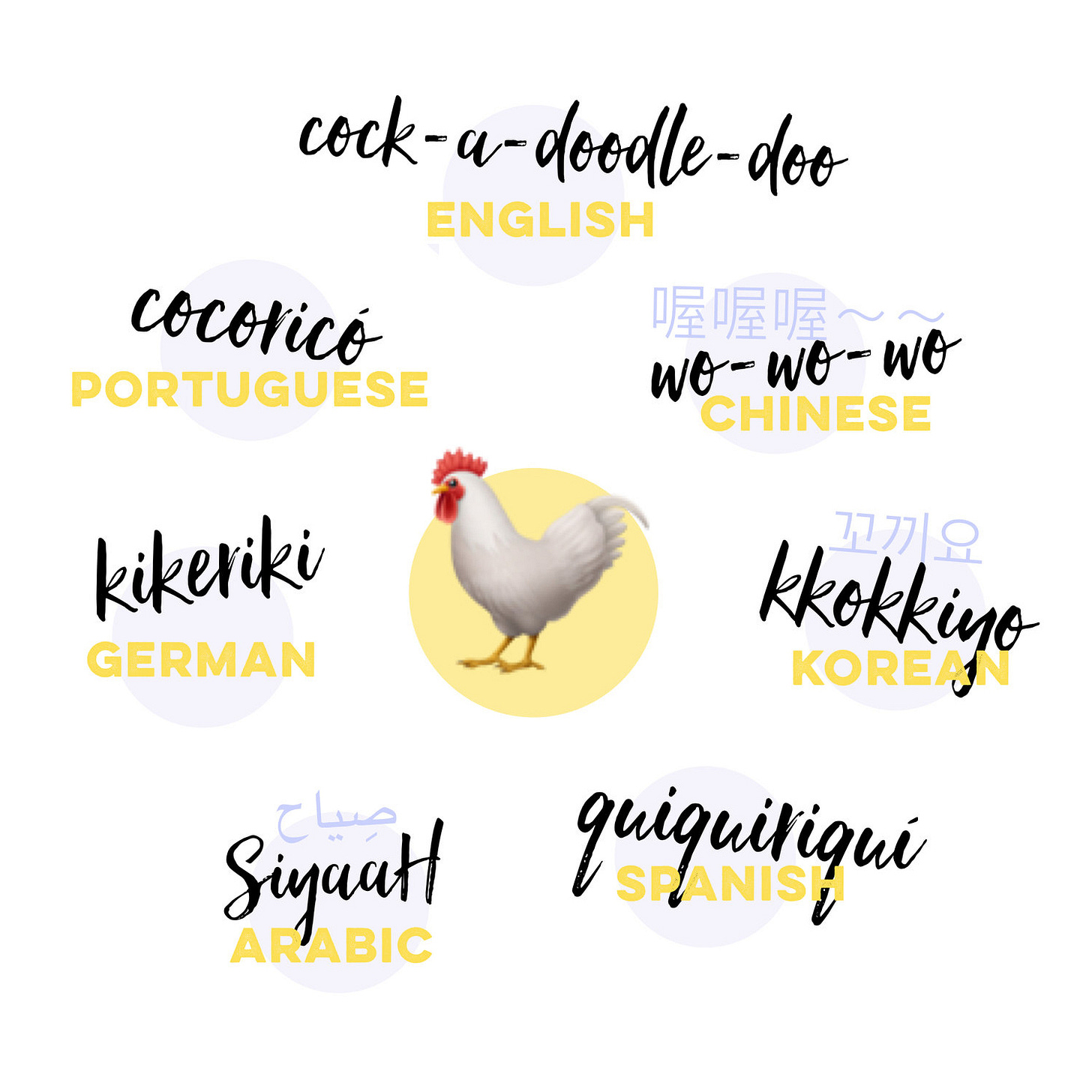 As different as animal sounds can be across languages, we can compare them to discover both similarities and surprising differences. Here are some examples: