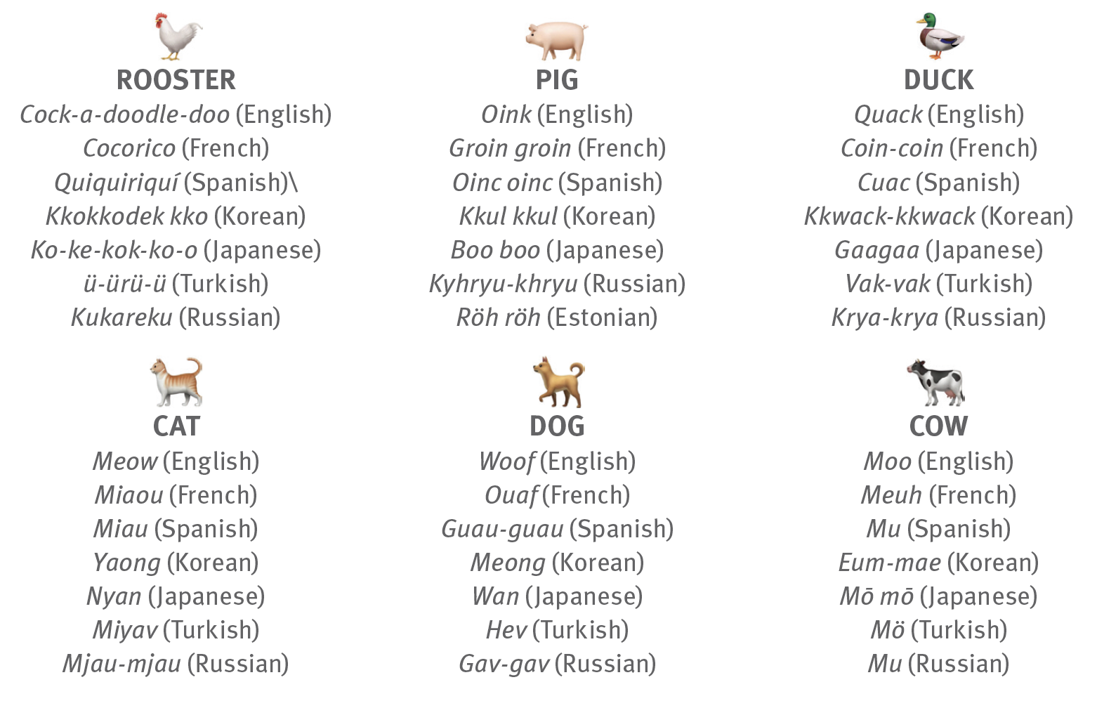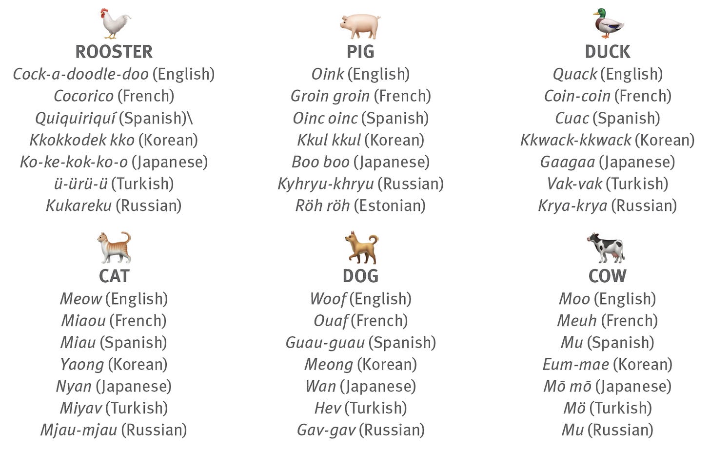 "Cock-a-doodle-doo" or "cocorico" – or maybe even "ko-ke-kok-ko-o"? What gives? We all hear the same animal sounds, but we imitate them differently in our native language.