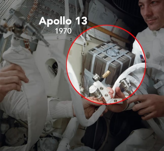 Back on Earth, NASA’s Mission Control in Houston worked around the clock. Engineers improvised solutions in real time, most famously devising a way to adapt square command-module CO₂ scrubbers to fit the round lunar-module system using only materials available onboard – plastic bags, cardboard and duct tape [RR4:28]. The solution worked, preventing carbon dioxide poisoning and becoming a symbol of human problem-solving at its best. Watch the scene from the 1995 Apollo 13 film below or HERE.