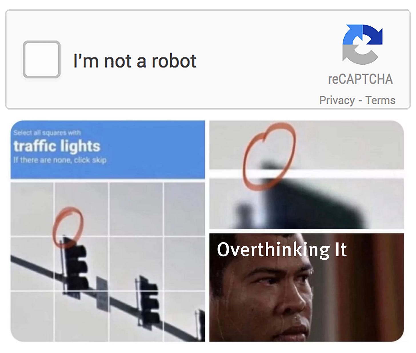 CAPTCHA is short for “Completely Automated Public Turing test to tell Computers and Humans Apart". So, are you a robot? Try not to overthink it.
