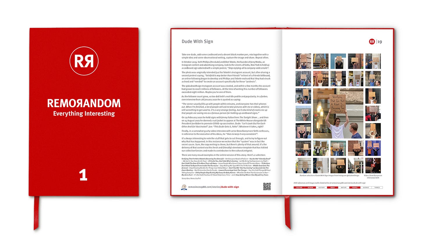 Since featuring Dude With Sign in REMORANDOM 1 we have noticed an increased number of obviously-paid-for collaborative posts that promote one thing or another. So Seth’s mother’s advice for Seth to “get a real job” may not be so urgent now.