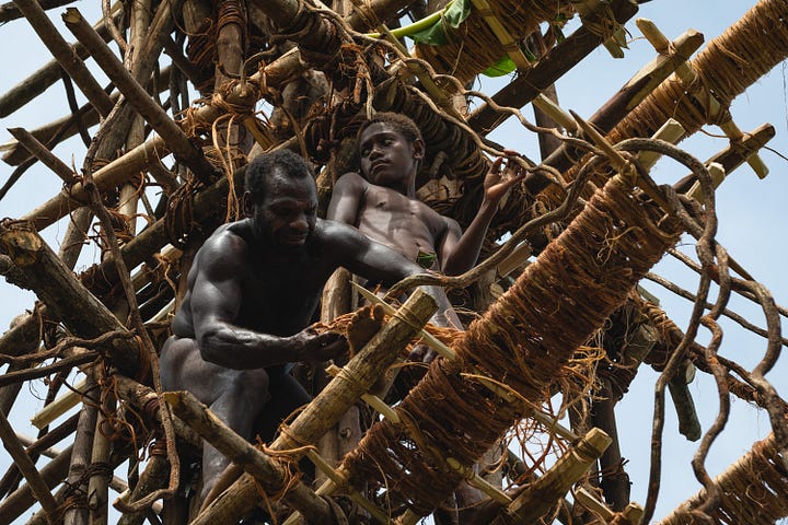 The jumping tower is a sight to behold. Its construction typically takes around 20 to 30 men between two and five weeks to construct. According to Margaret Jolly (“Kastom as Commodity: The Land Dive as Indigenous Rite and Tourist Spectacle in Vanuatu”, 1994), the tower: “symbolically represents a body, with a head, shoulders, breasts, belly, genitals and knees. The diving platforms represent the penises and the struts beneath represent the vaginas”. [Ed: If you say so.]