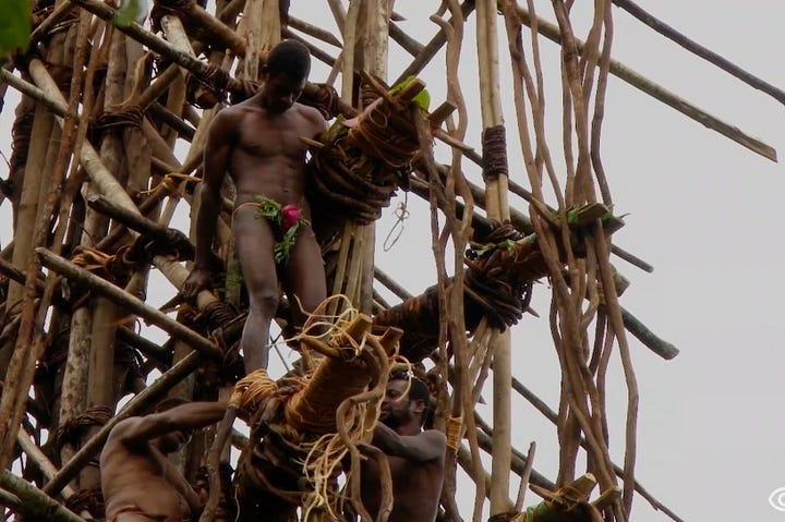 The villagers build the tower using local materials like liana vines and wood. The vines are chosen carefully to ensure they are strong enough to support the diver without breaking, but also elastic enough to absorb the shock of the fall.