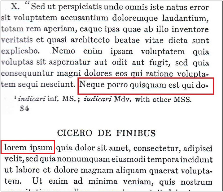 The passage in a 1914 edition from the Loeb Classical Library that McClintock found reads as follows: “Neque porro quisquam est qui do- [page break] lorem ipsum quia dolor sit amet, consectetur, adipisci velit”.