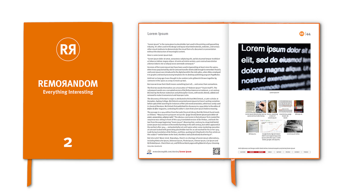 The obvious conclusion is that whoever first created the sequence was sitting in front of this 1914 translated version of De Finibus, and took the text from the page beginning “lorem ipsum”. Meaning that, contrary to a long held belief, Lorem ipsum was not born in the world of printing in the 16th century, but rather appeared at the earliest after 1914 – and potentially not until the 1960s when some marketing executive at Letraset tasked with generating placeholder text for an ad reached for his or her 1914 Loeb facing translation of De Finibus, and then, quoting Jack Shephard in his fine article on this subject “settled down to the hard, thankless task of absolutely butchering it”.