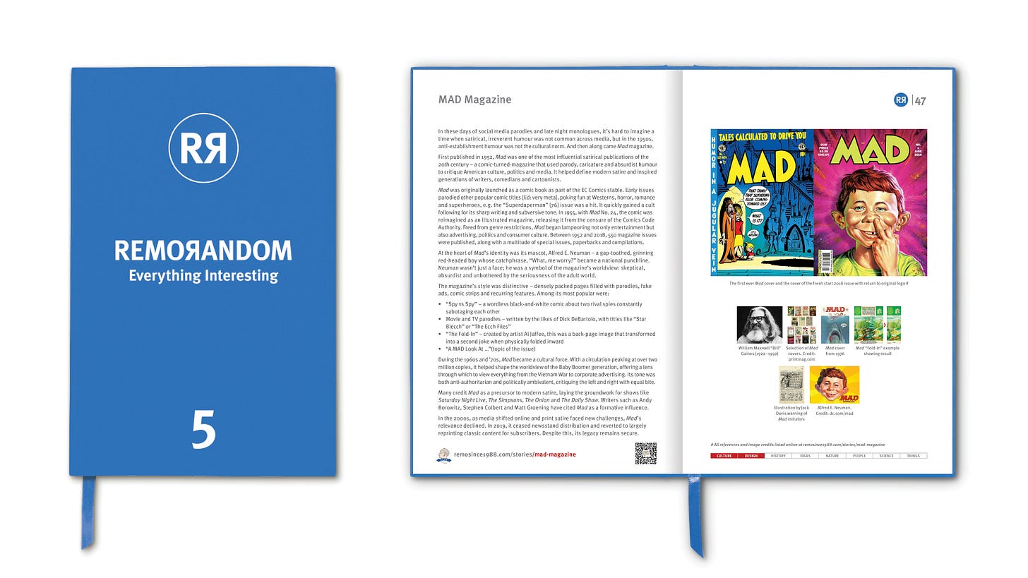 First published in 1952, Mad was one of the most influential satirical publications of the 20th century – a comic-turned-magazine that used parody, caricature and absurdist humour to critique American culture, politics and media. It helped define modern satire and inspired generations of writers, comedians and cartoonists.