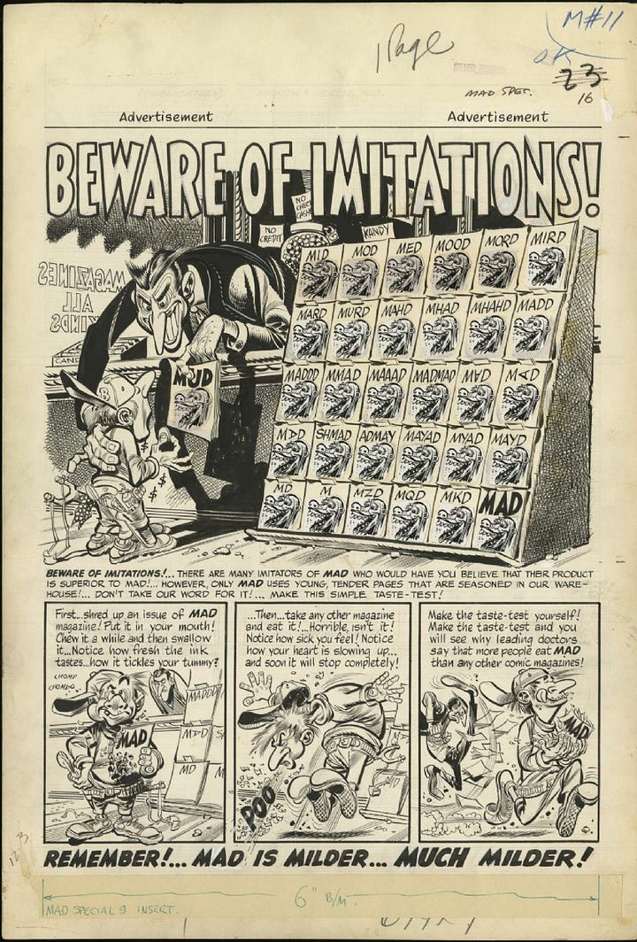 Mad was originally launched as a comic book as part of the EC Comics stable. Early issues parodied other popular comic titles [Ed: very meta], poking fun at Westerns, horror, romance and superheroes, e.g. the “Superduperman” [76] issue was a hit. It quickly gained a cult following for its sharp writing and subversive tone. In 1955, with Mad No. 24, the comic was reimagined as an illustrated magazine, releasing it from the censure of the Comics Code Authority. Freed from genre restrictions, Mad began lampooning not only entertainment but also advertising, politics and consumer culture. Between 1952 and 2018, 550 magazine issues were published, along with a multitude of special issues, paperbacks and compilations.