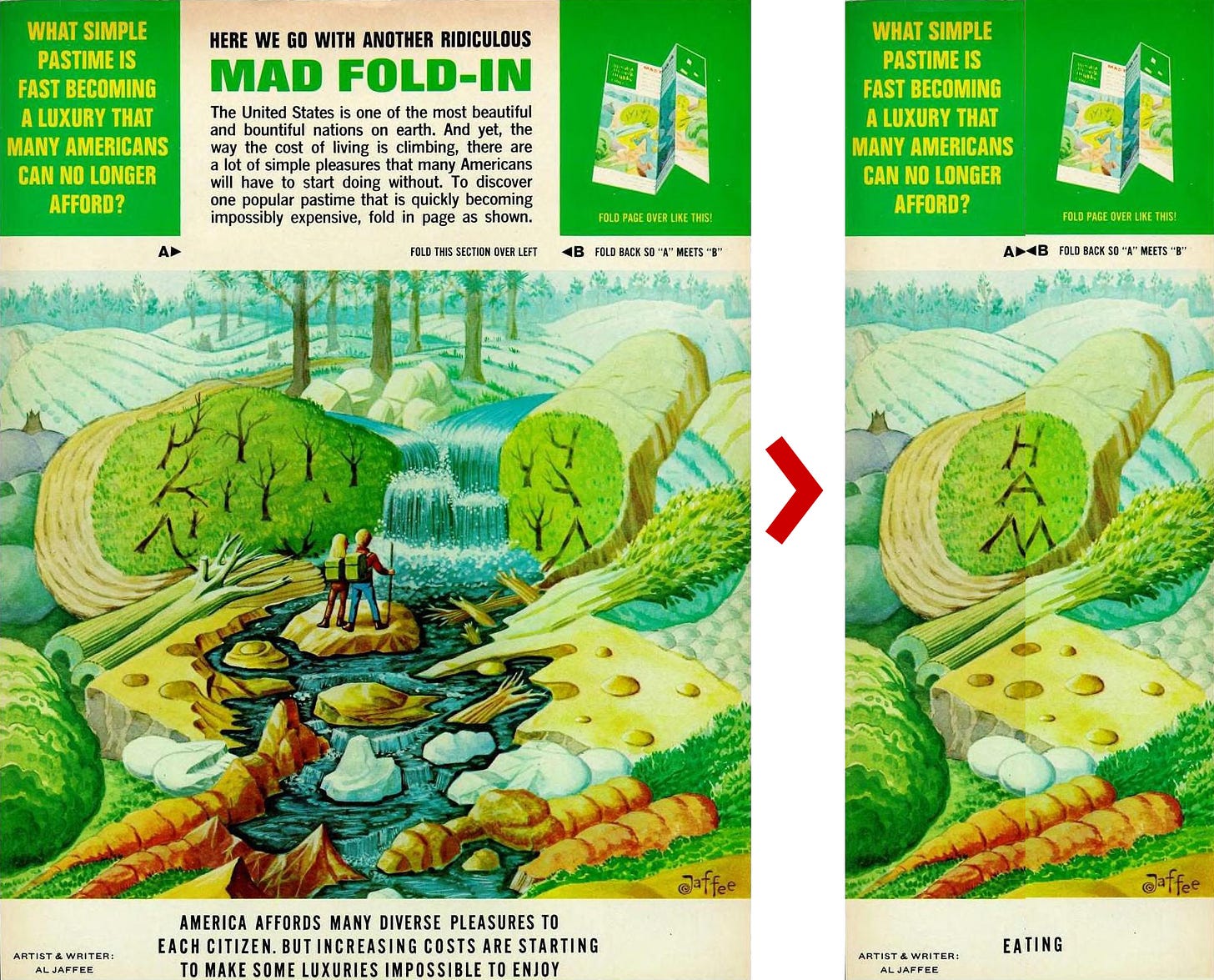 “The Fold-In” – created by artist Al Jaffee, this was a back-page image that transformed into a second joke when physically folded inward