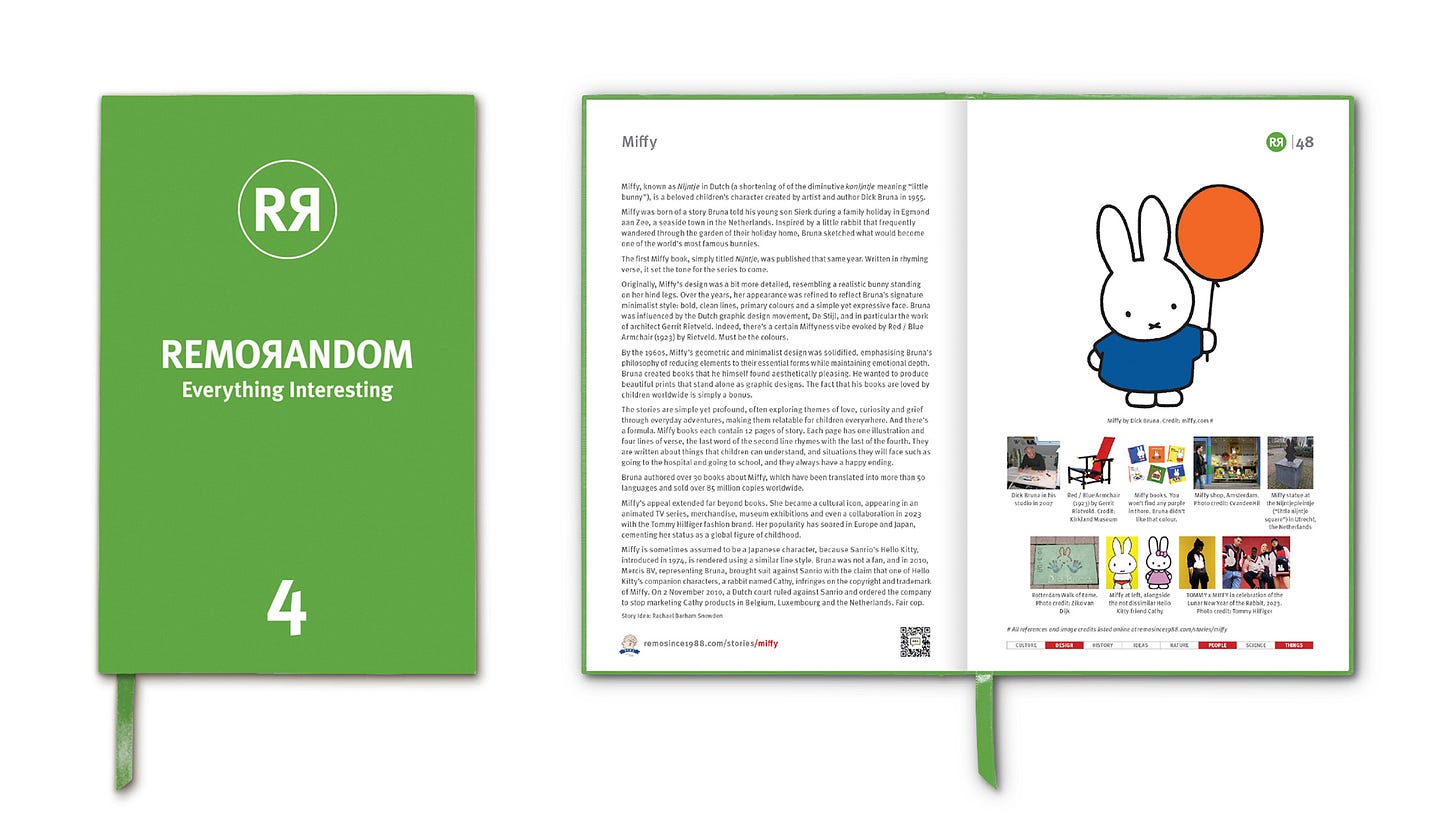 Originally, Miffy’s design was a bit more detailed, resembling a realistic bunny standing on her hind legs. Over the years, her appearance was refined to reflect Bruna’s signature minimalist style: bold, clean lines, primary colours and a simple yet expressive face. Bruna was influenced by the Dutch graphic design movement, De Stijl, and in particular the work of architect Gerrit Rietveld. Indeed, there’s a certain Miffyness vibe evoked by Red / Blue Armchair (1923) by Rietveld. Must be the colours.