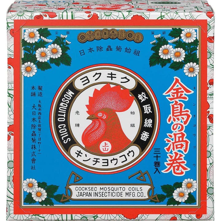 Since then, very little has changed about Ueyama’s “Kincho” brand coils, including the deep green colour and the old school packaging with the trademark red rooster head.