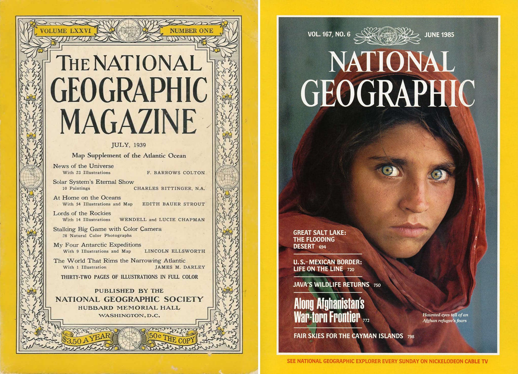 No cover is more famous than the one from June 1985 bearing the portrait and piercing green-eyed gaze of “Afghan Girl” (later identified as Sharbat Gula), shot by photographer Steve McCurry near the Pakistani city of Peshawar. Gula, an ethnic Pashtun from Afghanistan’s Nangarhar Province, was a 12-year-old child then residing in Pakistan’s Nasir Bagh.