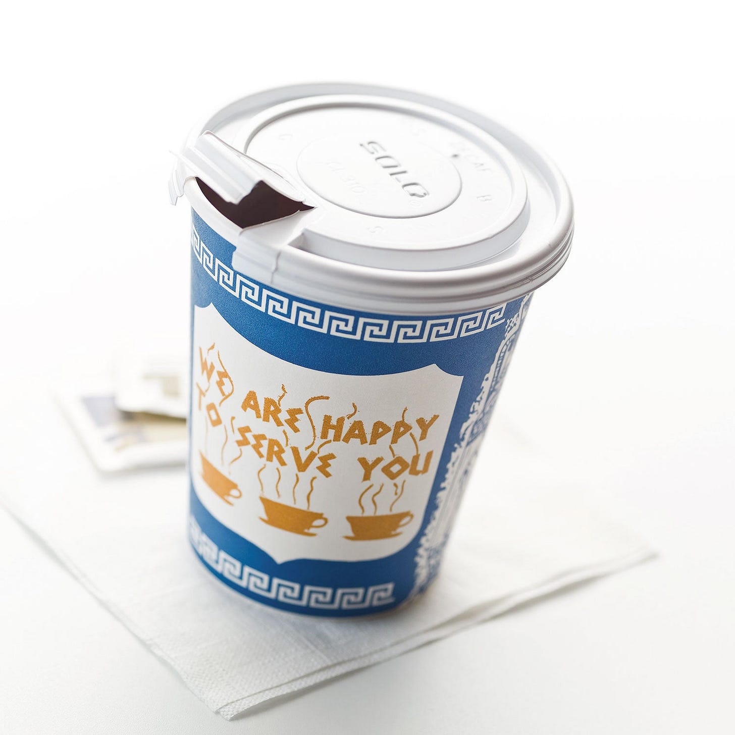 The blue and white palette was inspired by the colours of the Greek flag, and the Greek Key border pattern is an iconic design seen throughout ancient Greek architecture. On each side of the cup appears an urn, the “Anthora” symbol; then, in bold angular lettering, the heart-warming words, “We are Happy to Serve You”.