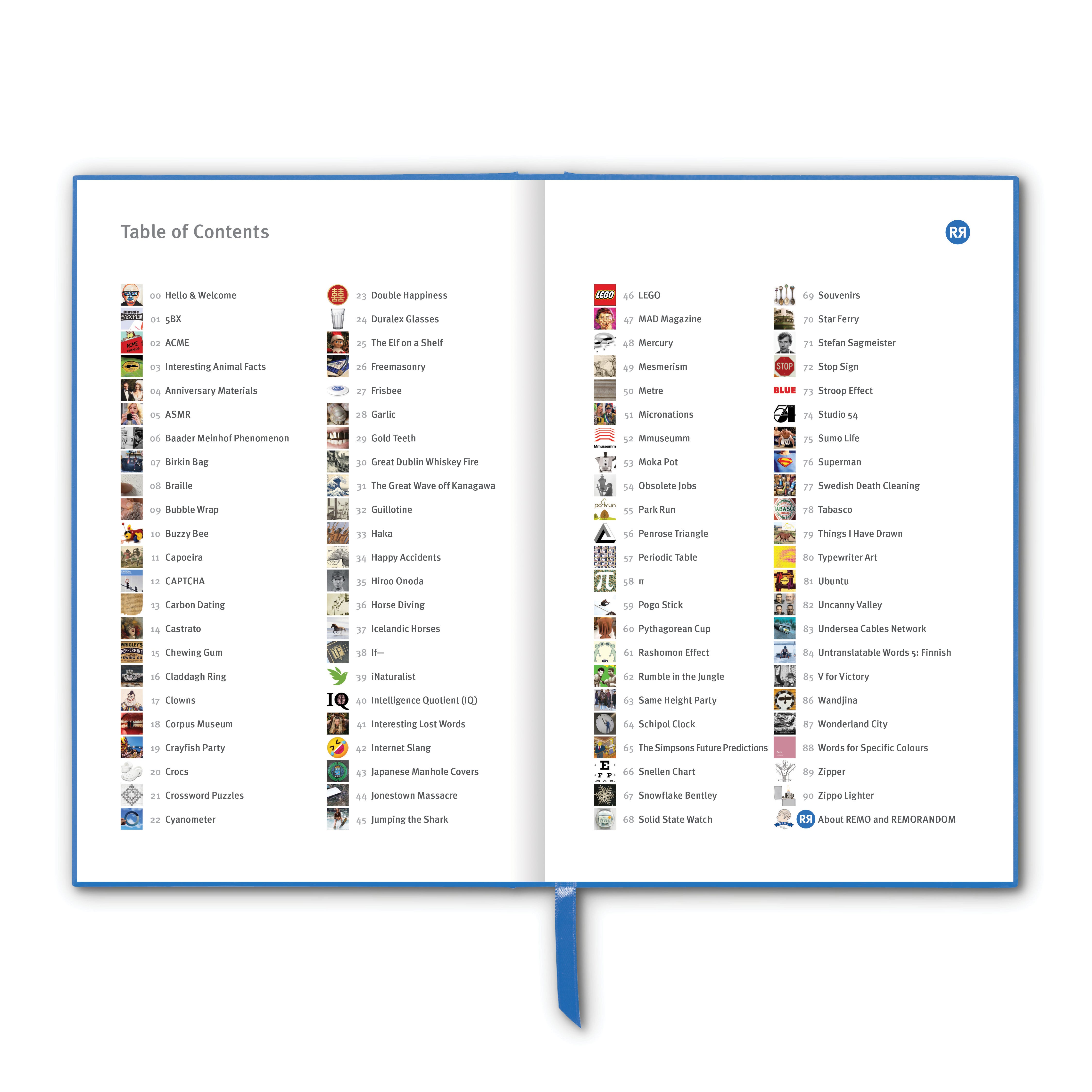 REMORANDOM 5 contains the usual serendipitous curation of uncommon knowledge. Here’s the table of contents, followed by a grid of sample spreads.