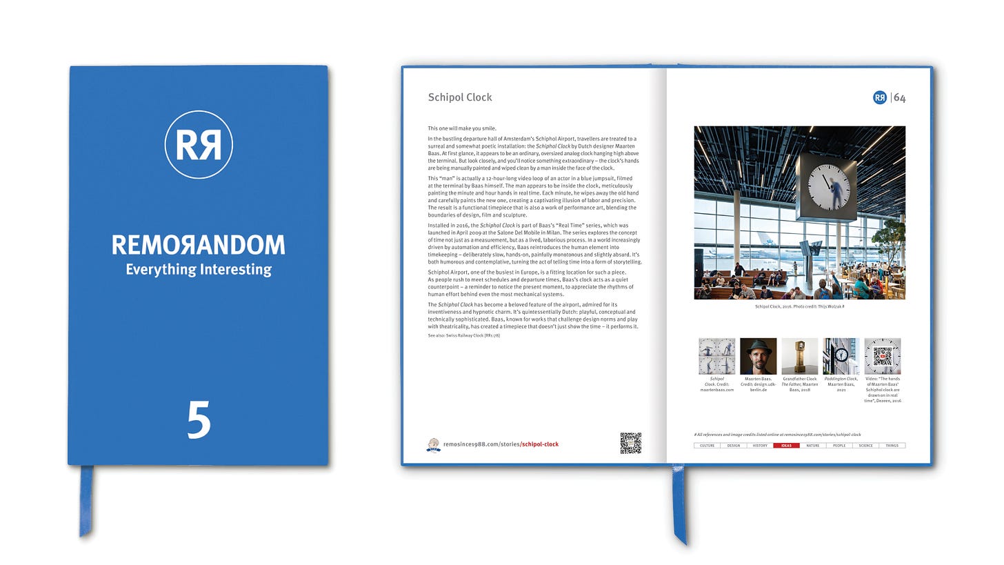 Installed in 2016, the Schiphol Clock is part of Baas’s “Real Time” series, which was launched in April 2009 at the Salone Del Mobile in Milan. The series explores the concept of time not just as a measurement, but as a lived, laborious process. In a world increasingly driven by automation and efficiency, Baas reintroduces the human element into timekeeping – deliberately slow, hands-on, painfully monotonous and slightly absurd. It’s both humorous and contemplative, turning the act of telling time into a form of storytelling.