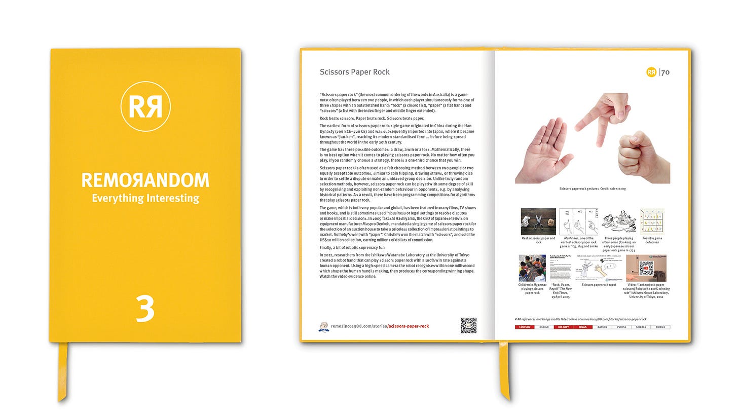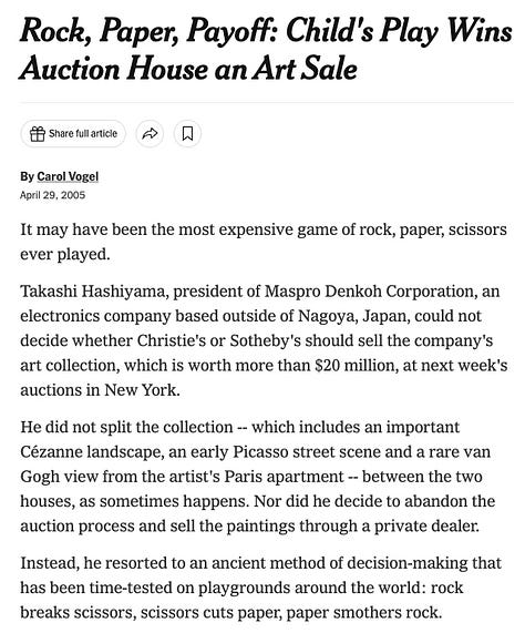 In 2005 Takashi Hashiyama, the CEO of Japanese television equipment manufacturer Maspro Denkoh, mandated a single game of scissors paper rock for the selection of an auction house to take a priceless collection of Impressionist paintings to market. Sotheby’s went with “paper”. Christie’s won the match with “scissors”, and sold the US$20 million collection, earning millions of dollars of commission.