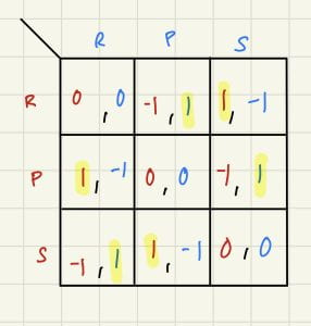 The game has three possible outcomes: a draw, a win or a loss. Mathematically, there is no best option when it comes to playing scissors paper rock. No matter how often you play, if you randomly choose a strategy, there is a one-third chance that you win.