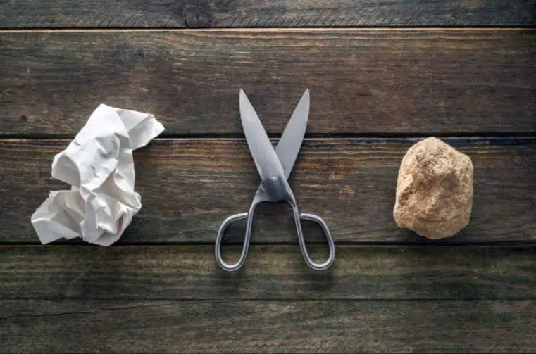 Rock beats scissors. Paper beats rock. Scissors beats paper.