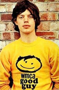 A yellow and black smiley was used by New York radio station WMCA for its “Good Guys” marketing campaign in 1962, and within a year over 11,000 yellow campaign sweatshirts they produced had been given away – including one, it would seem, to Mick Jagger.