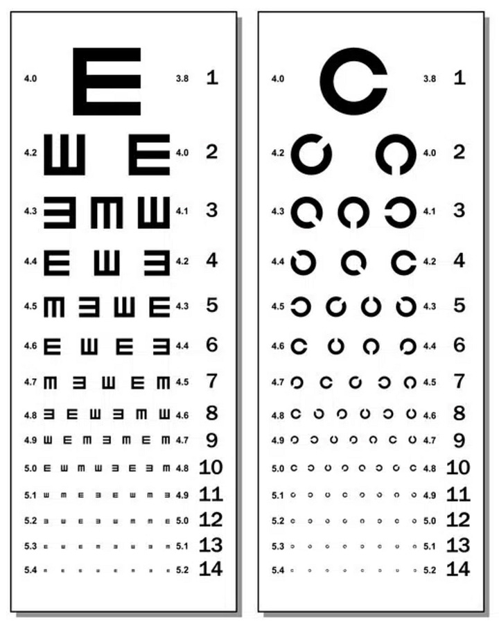 Snellen accounted for illiteracy by creating “The Tumbling E” chart. That version of the chart maintained the same level of geometric consistency but only had a series of letter Es positioned in different directions. This chart worked because the letter E could be replicated by a person holding three fingers (index, middle and ring finger). So, as they looked at the charts, first with one eye covered – then the other eye covered – and then with both eyes open – patients used three fingers to demonstrate the orientation of the E. (The Landoldt C chart uses the same idea as the tumbling E, but using the patient’s cupped hand to recreate a C.)