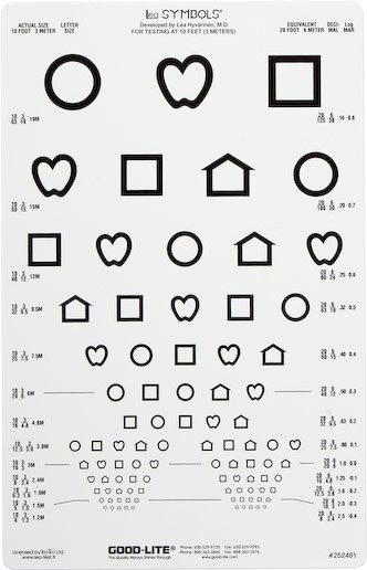 There are also Snellen-like charts that use symbols rather than letters. Historically, symbols were intentionally selected to represent common everyday objects, like a house, tree, flower, umbrella, bird, etc. This made it easier for patients to identify what’s what. Today, we use a standardised version called the LEA symbols chart, which uses a square, house, apple and circle.