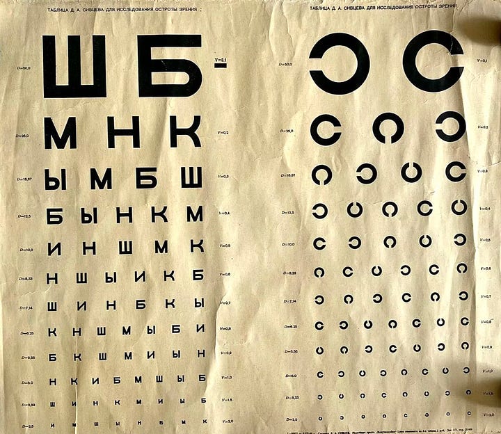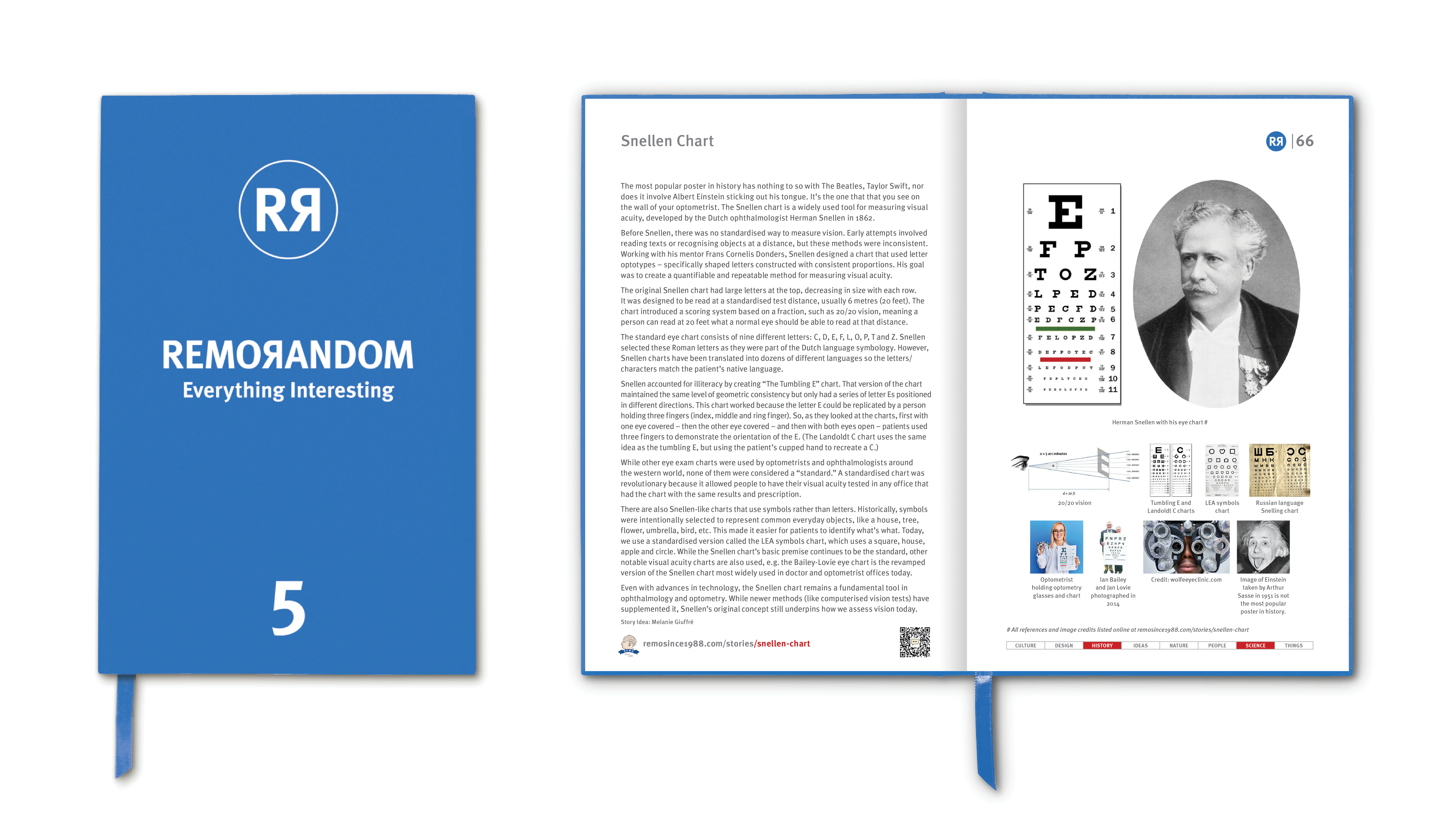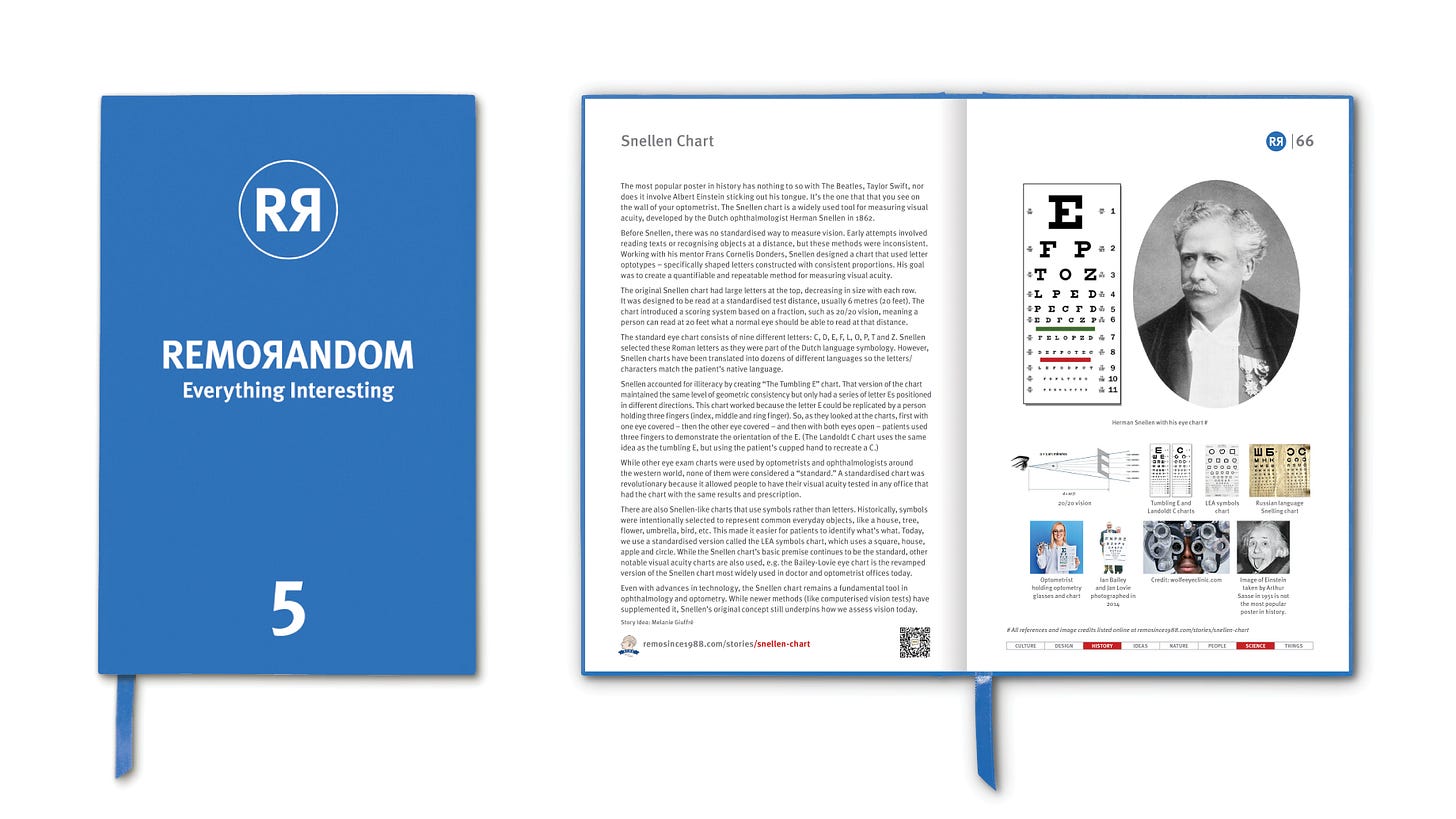 While other eye exam charts were used by optometrists and ophthalmologists around the western world, none of them were considered a “standard.” A standardised chart was revolutionary because it allowed people to have their visual acuity tested in any office that had the chart with the same results and prescription.