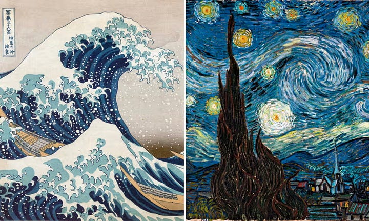 Martin Bailey, a specialist on Vincent van Gogh, believes that the Dutch artist drew inspiration from Hokusai’s Great Wave when he painted one of his most dazzling and celebrated works, The Starry Night. Side by side, the similarities are striking. In the Hokusai the wave towers over the volcanic peak of Mount Fuji. In the van Gogh, according to Bailey, “the swirling mass in the sky hurtles towards the more gentle slopes of Les Alpilles”.