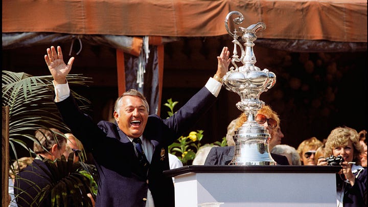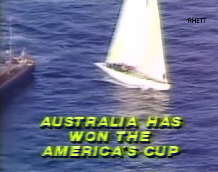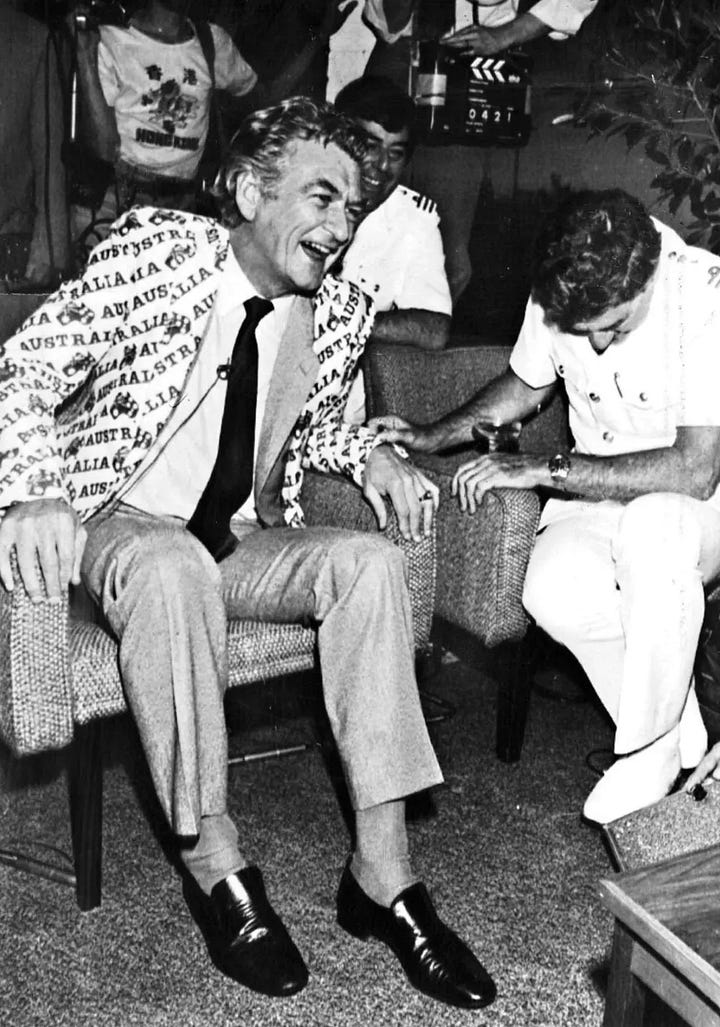 The Cup – won by the best of seven races over several weeks – was tied at three-all at the final start line. Australia II’s crew battled nerves after a false start, but after swapping the lead with the NYYC’s Liberty three times, ultimately won by 41 seconds.