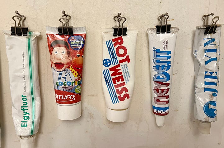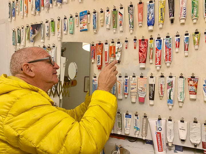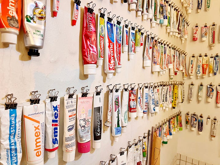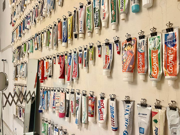 Tucker’s international collection is something to behold, and our favourite thing about it is its functionality. Each tube of toothpaste is clipped and hangs from a nail. He can choose to brush his teeth using any one of the 439 toothpastes currently on display.
