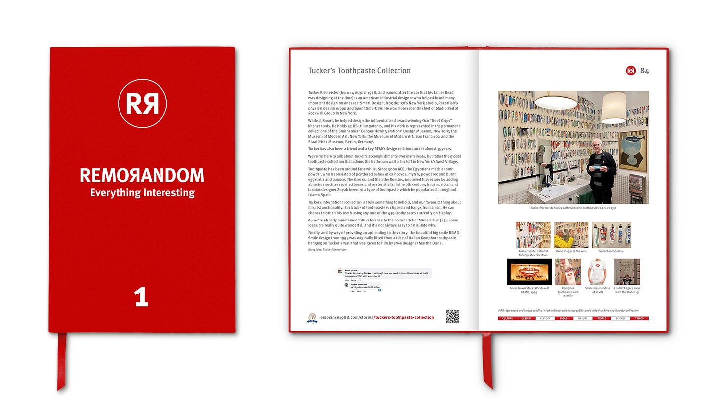 In this episode Remo speaks with Tucker about: his famous toothpaste collection (see above), odd ball motor cars, industrial design, AI and other interesting things. It’s a fun chat. Tucker is possibly best known for his work on OXO Good Grips kitchen tools at Smart Design, a company he helped found in 1979. He also founded the Lab at Rockwell Group, and was VP of physical design at the digital agency, Razorfish – and before that at frog design. His collaborations over the years are too numerous to mention. Tucker has also been a friend of REMO (and Remo) for a very long time.