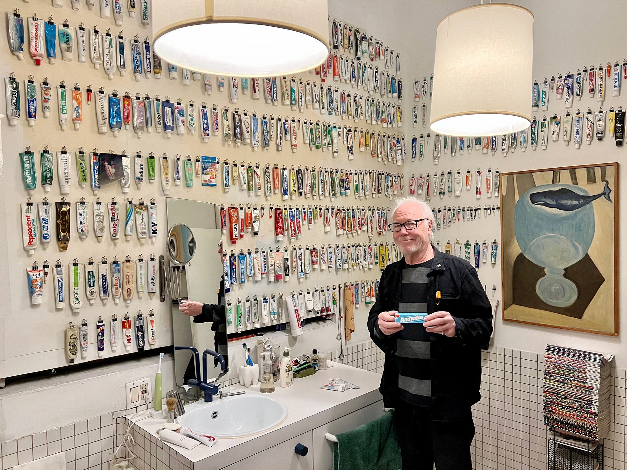 We’re not here to talk about Tucker’s accomplishments over many years, but rather the global toothpaste collection that adorns the bathroom wall of his loft in New York’s West Village.