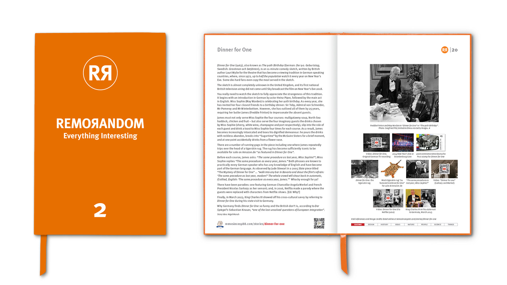 Finally, in German-speaking countries, a 1962 black-and-white British comedy sketch called “Dinner for One” has become traditional viewing on New Year’s Eve. This one is so weird we’ve decided to feature it separately. See [RR2:20].