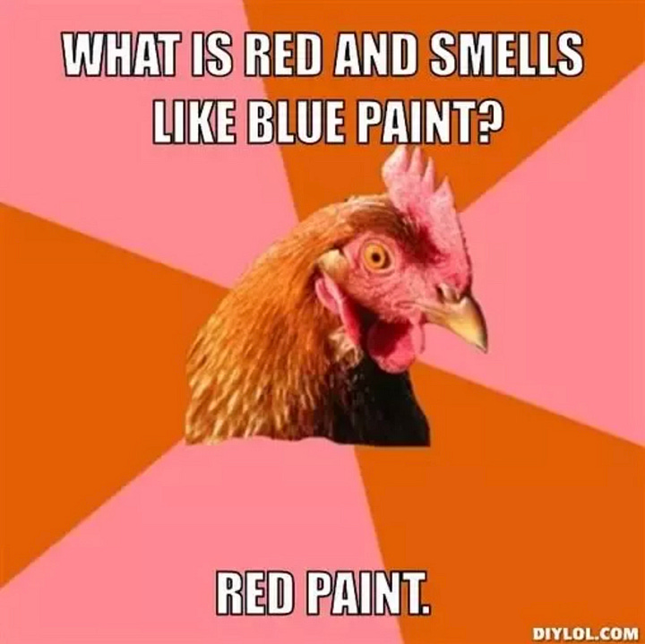 What’s red and smells like blue paint? Red paint.