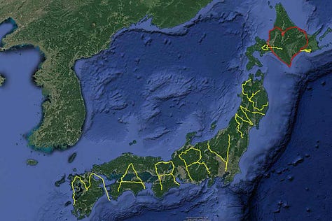 Once the design was ready, Yassan quit his job, somewhat perplexing his girlfriend, and dedicated himself entirely to his secret project. Over six months, he travelled more than 7,000km across Japan, mostly on foot and by bicycle, carrying a GPS tracker to record his movements. He slept in his car. Every step of his journey was a piece of the puzzle, contributing to the giant artwork he envisioned.